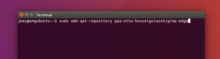 sudo add-apt-repository ppa:otto-kesselgulasch/gimp-edgeThis will prompt you to enter your password (do so) and then hit ‘enter’. Remember: you won’t see asterisks or any other feedback when entering your password in a terminal, so type carefully!