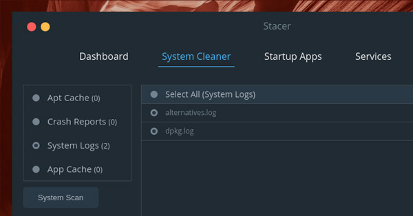 The ‘System Cleaner‘ section is able to scan common cruft-filled directories and list their contents for deletion. It covers four sections: