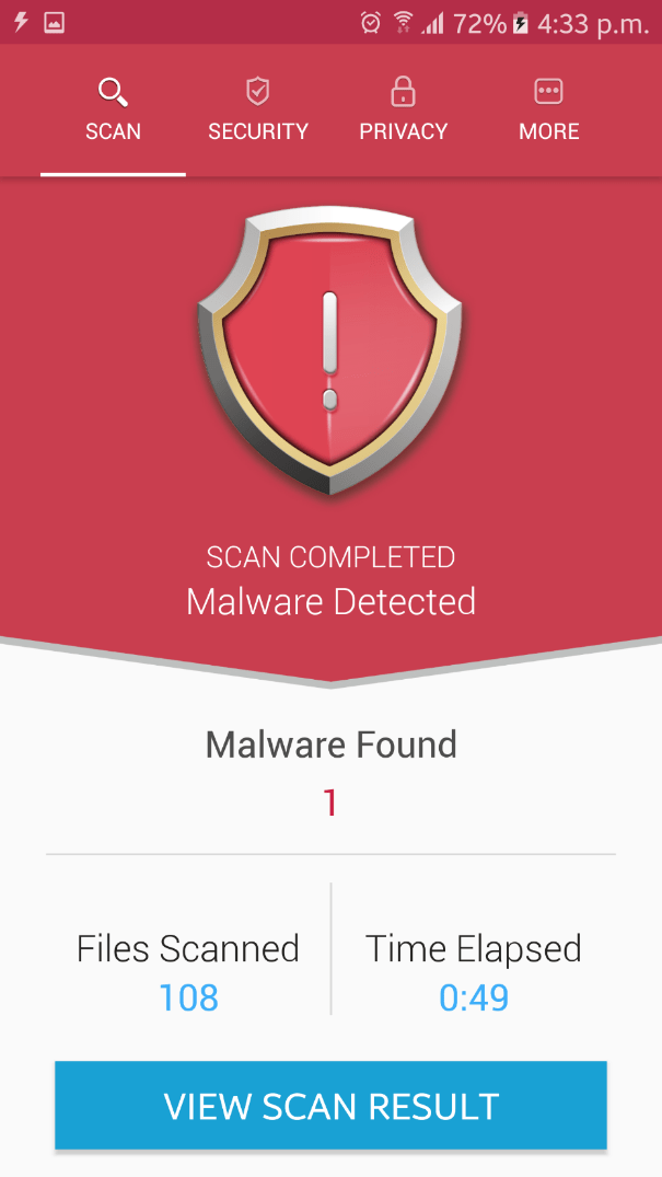 Once the Scanning has been performed, the results will be displayed including information like number of files scanned, time elapsed and malware found. If your Android device is 100% malware free, then you’ll be prompted with a message saying “NO Threats Detected”alongside a green colored check box. Or else if your device is infected with malware then it will display message Malware Detected with a red background. Tap on the “View Scan Result” button to proceed further.