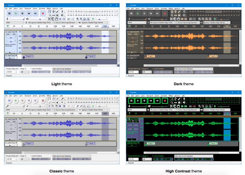 Audacity 2.2 includes a set of four new UI themes, including a new, flatter, modern light look by default, plus optional dark, classic and high contrast skins.